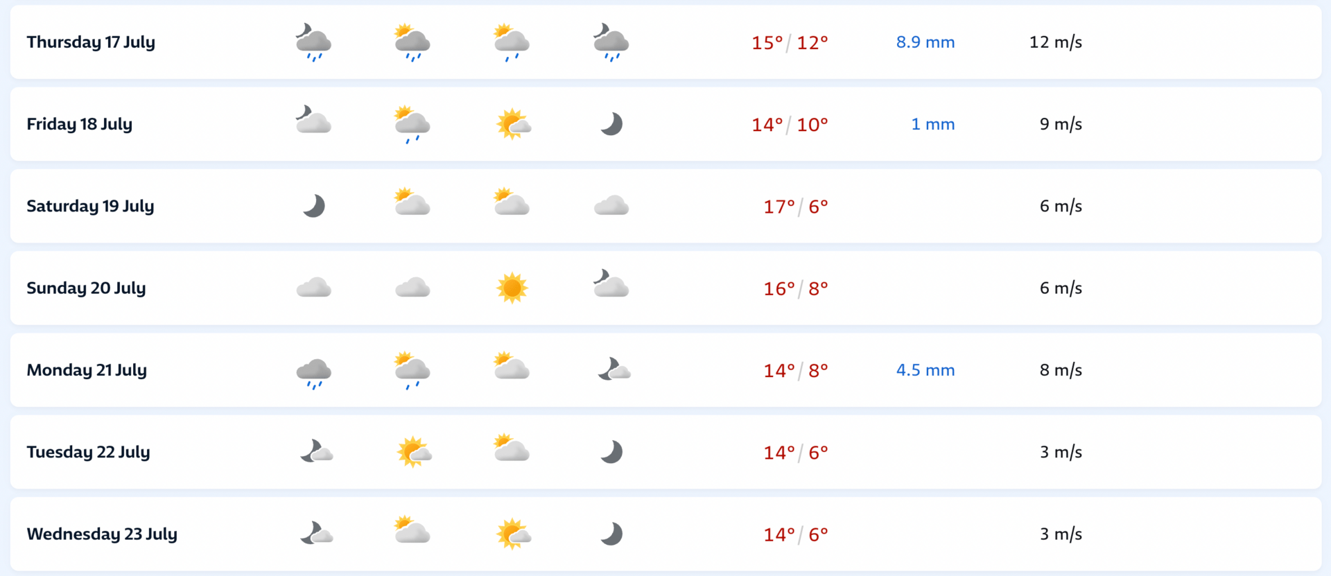 Moody morning, golden afternoon. 🌦️ A touch of rain early on (1 mm), then the skies clear by midday. High of 14°C, low of 10°C, and winds calming down to 9 m/s. It’s a day with two personalities - plan accordingly.