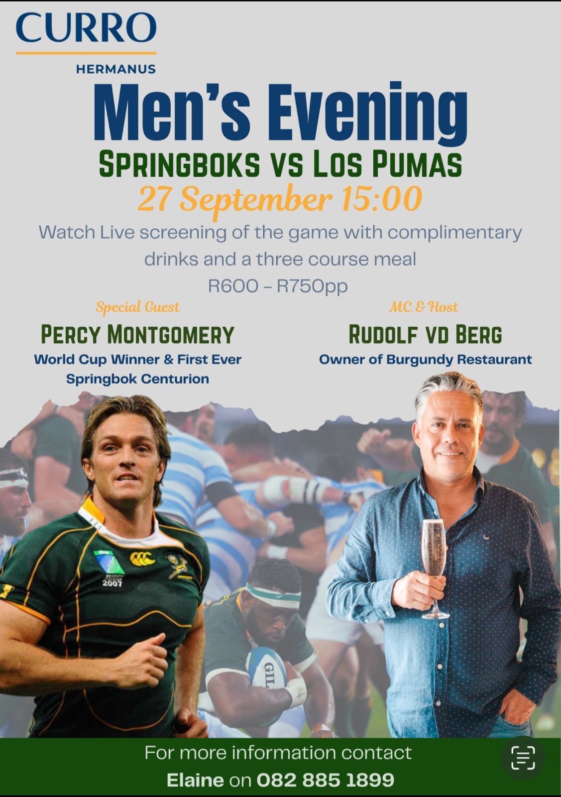 Watch Springboks vs Los Pumas live on big screens. Includes live entertainment, auction, and lucky draw prizes.
