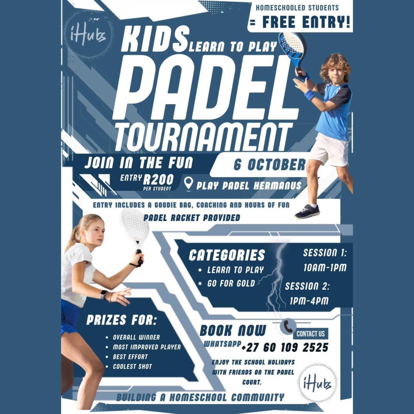 ✨ Kids learn to play padel with coaching, fun games, and prizes. Categories include “Learn to Play” and “Go for Gold.” Padel rackets provided, plus goodie bags included.