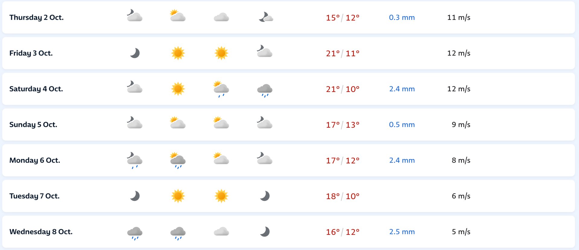 Partly cloudy, fresh. 🌥️ 15°C / 12°C. Winds 11–7 m/s.