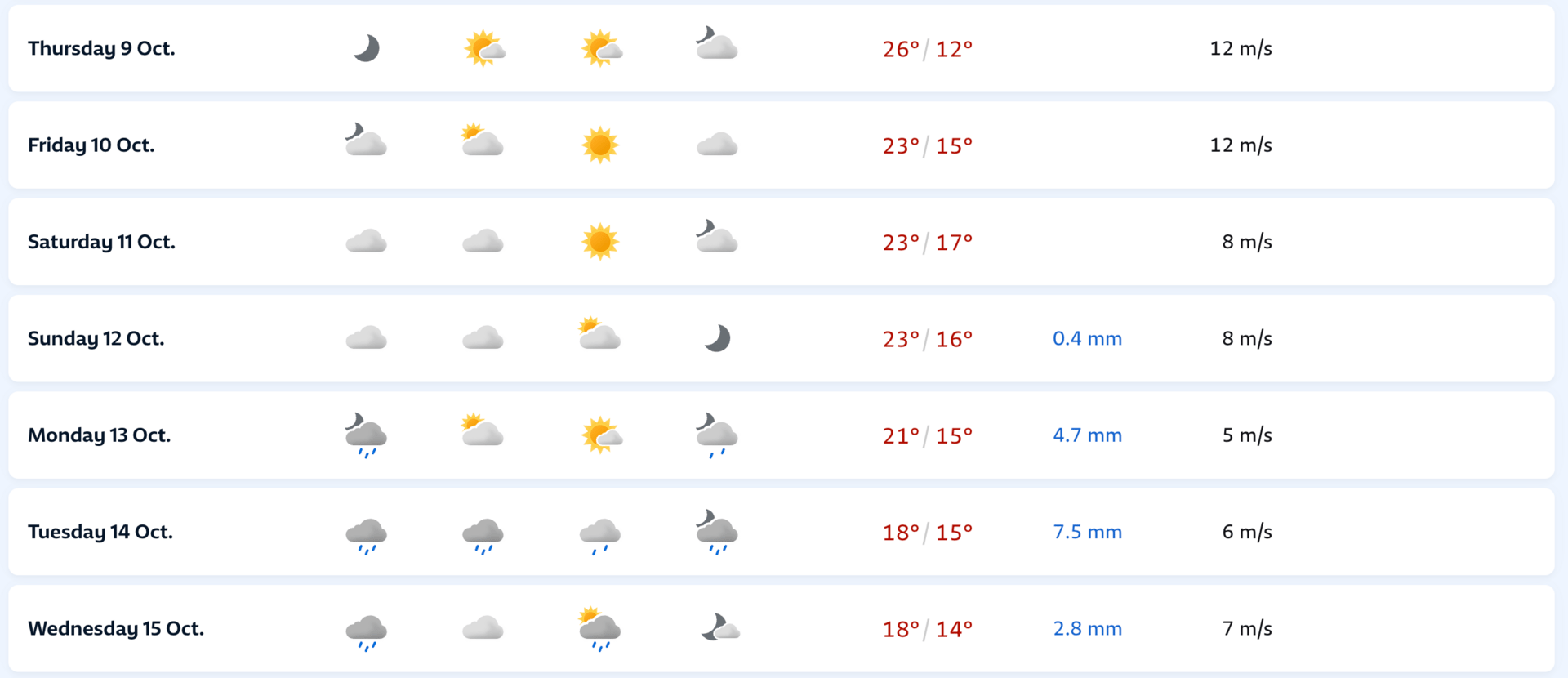 Warm with some cloud. 🌤️ 23°C / 15°C. Winds 12 - 7 m/s.