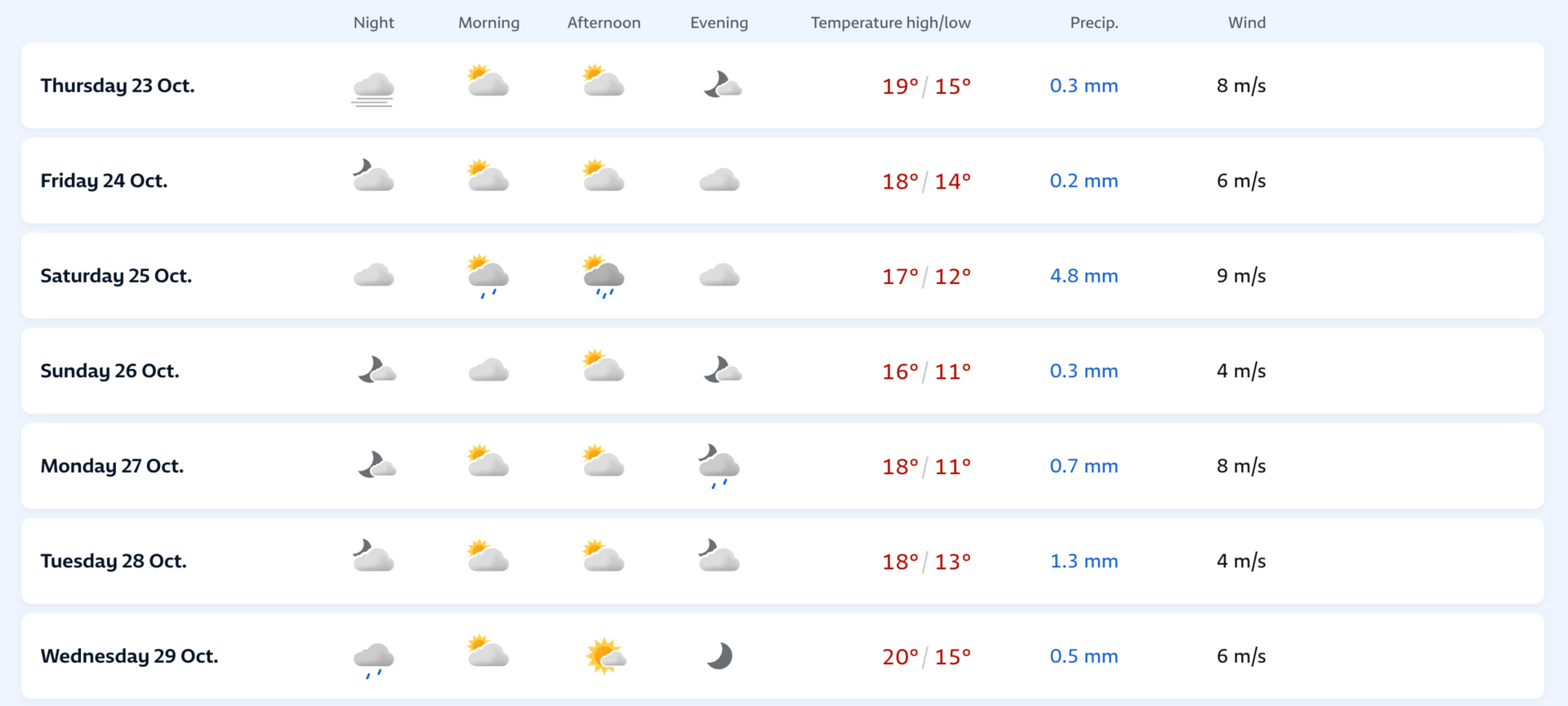 Partly cloudy and warmer. 🌤️ 18°C / 11°C, 0.7 mm rain. Winds 8-3 m/s.