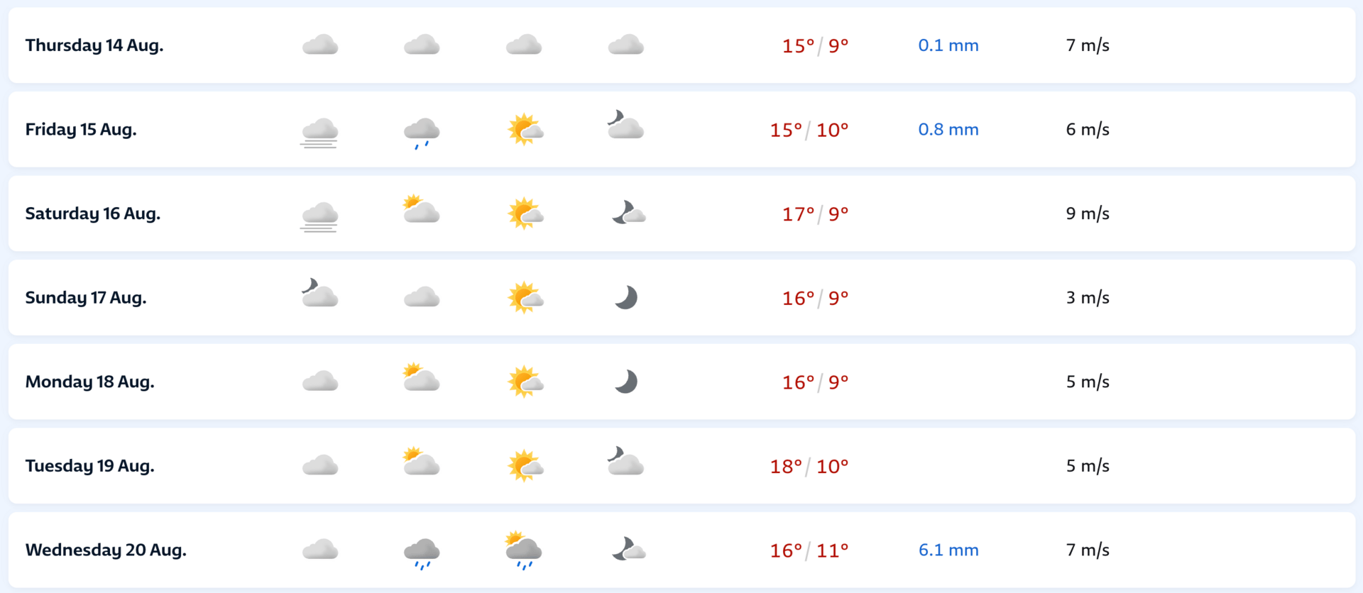 Clear and lively. ☀️ Warmest day so far at 17°C, low of 9°C. A gentle breeze at 9 m/s in the morning, fading to 3 m/s. A good day for the coast - or the market.