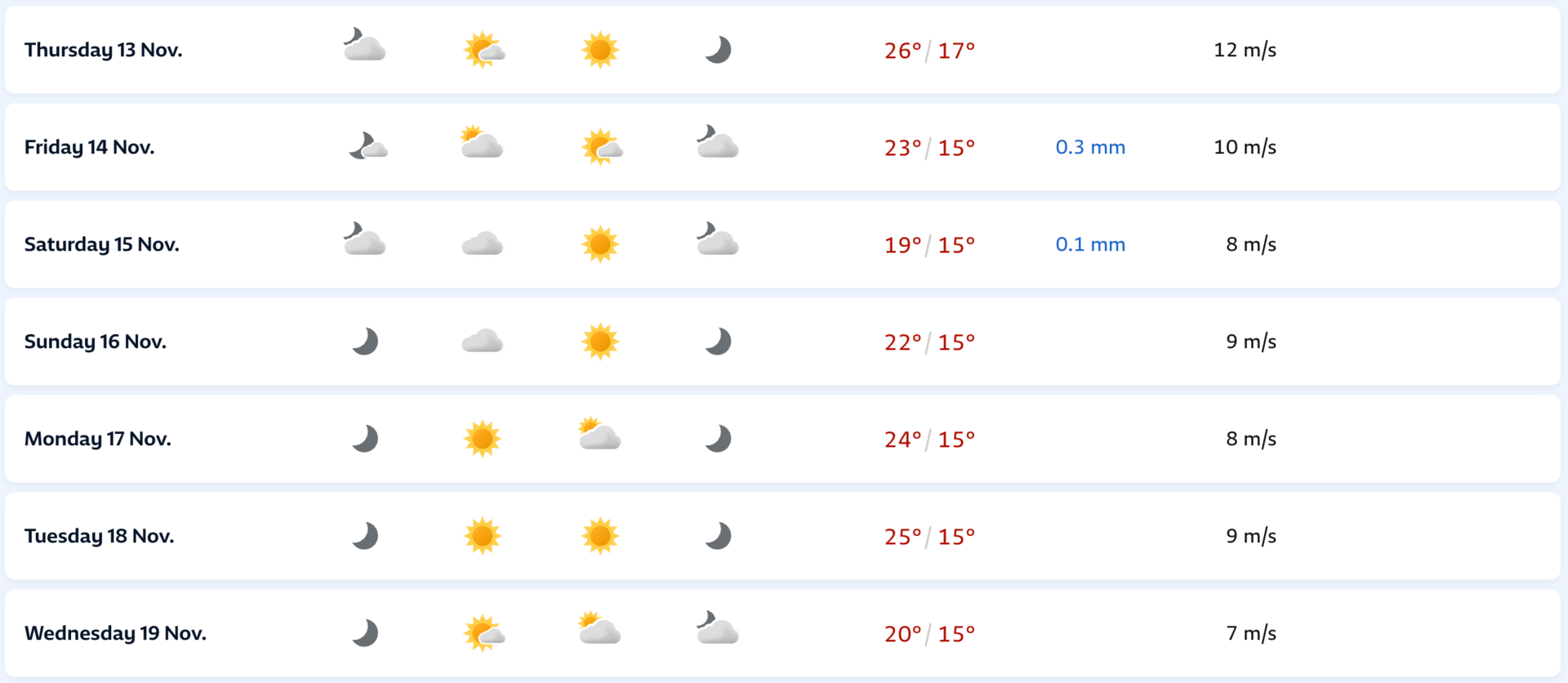A touch warmer and sunnier - ideal for brunch outdoors or a beach wander. ☀️ 22°C / 15°C, 0.0 mm rain. Winds 9–5 m/s.