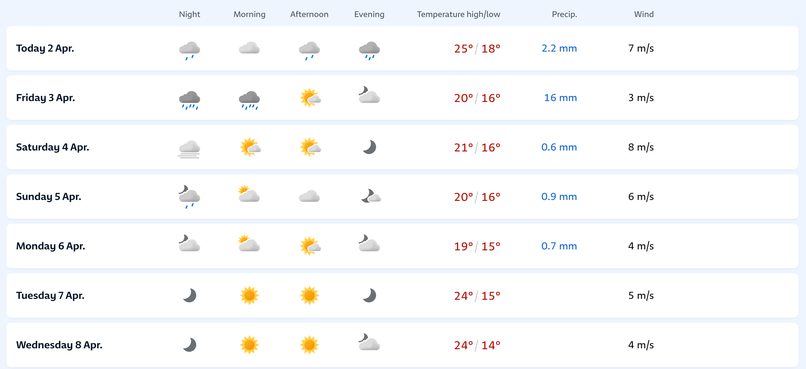 25°C / 18°C Rain ~2.2 mm Winds 7 / 1 m/s