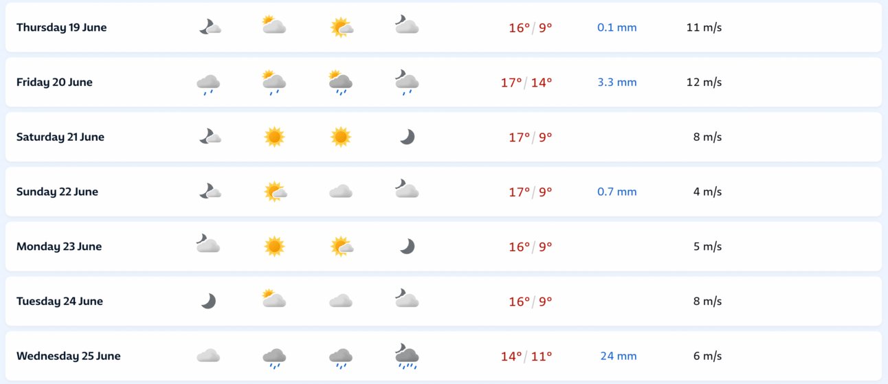 Wet and gusty with up to 24 mm forecast. High of 14°C, low of 11°C. Keep that umbrella close.